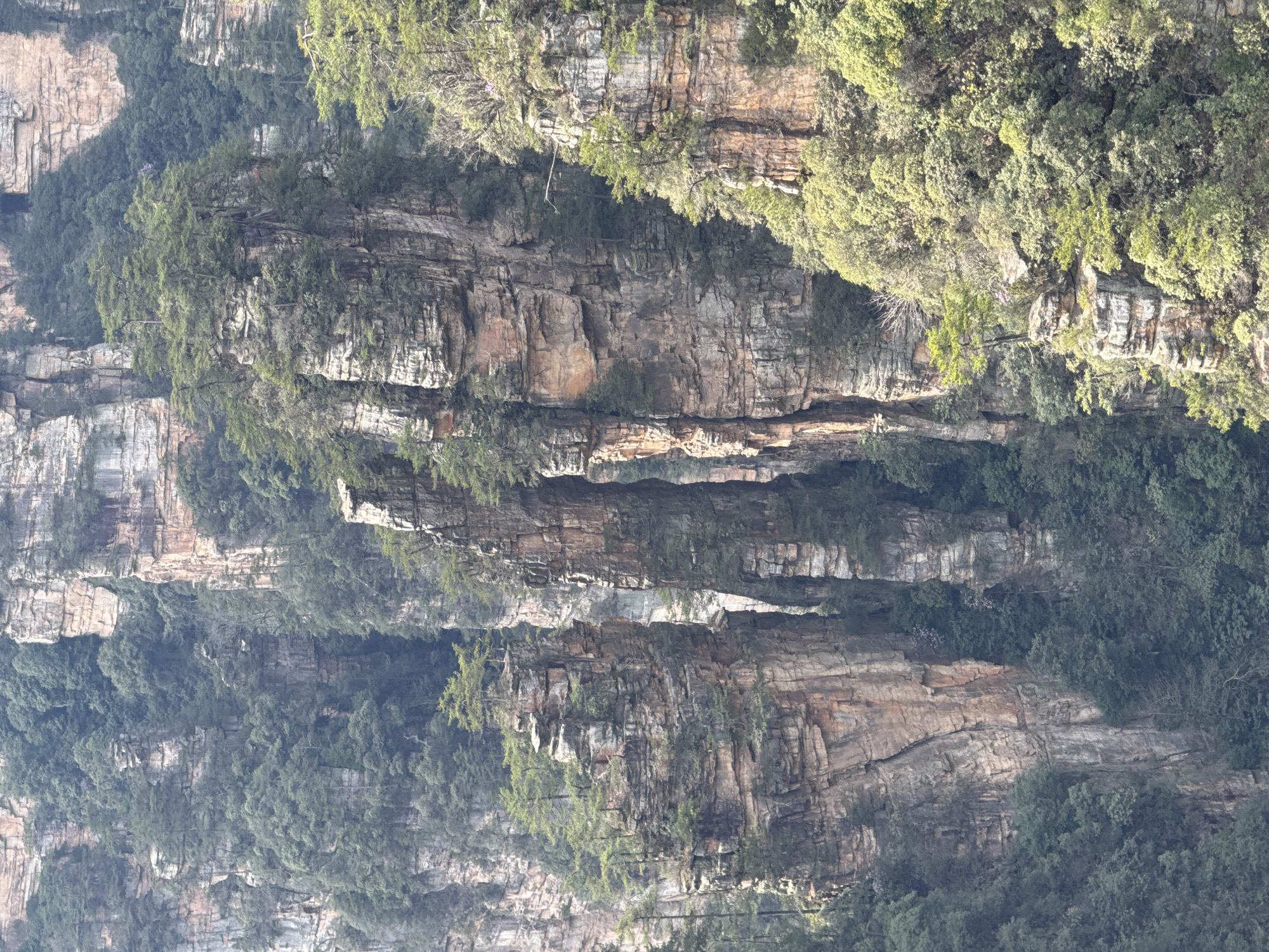 The image depicts a dramatic mountainous landscape within the Zhangjiajie National Forest Park, Hunan Province, China. Numerous towering, weathered sandstone pillars dominate the scene, characterized by vertical faces and layered rock formations exhibiting shades of grey, brown, and light orange. Deep, narrow ravines separate the colossal rock columns. Dense, verdant vegetation, primarily evergreen trees and shrubs, covers the ledges, slopes, and summits of the pillars and fills the valleys below. No human presence, structures, or activity are visible.