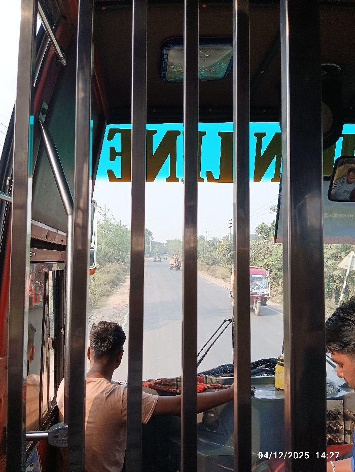 - "The image displays an interior perspective from a vehicle, likely a bus, looking forward through a partition of six vertical metal bars onto a road in Kaliganj, Bangladesh" by FM-qwTJi2, licensed under CC BY 4.0