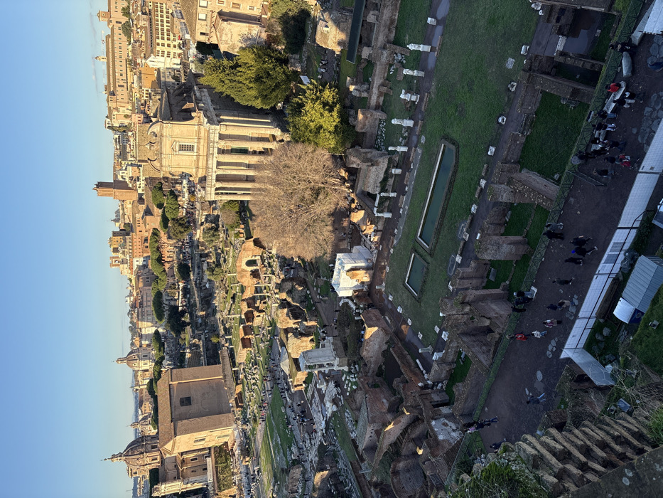 - "The image presents an elevated, panoramic view of the Roman Forum and Palatine Hill in Rome, Italy, under clear, blue skies with low-angle sunlight creating extended shadows" by FM-E1hwL2, licensed under CC BY 4.0