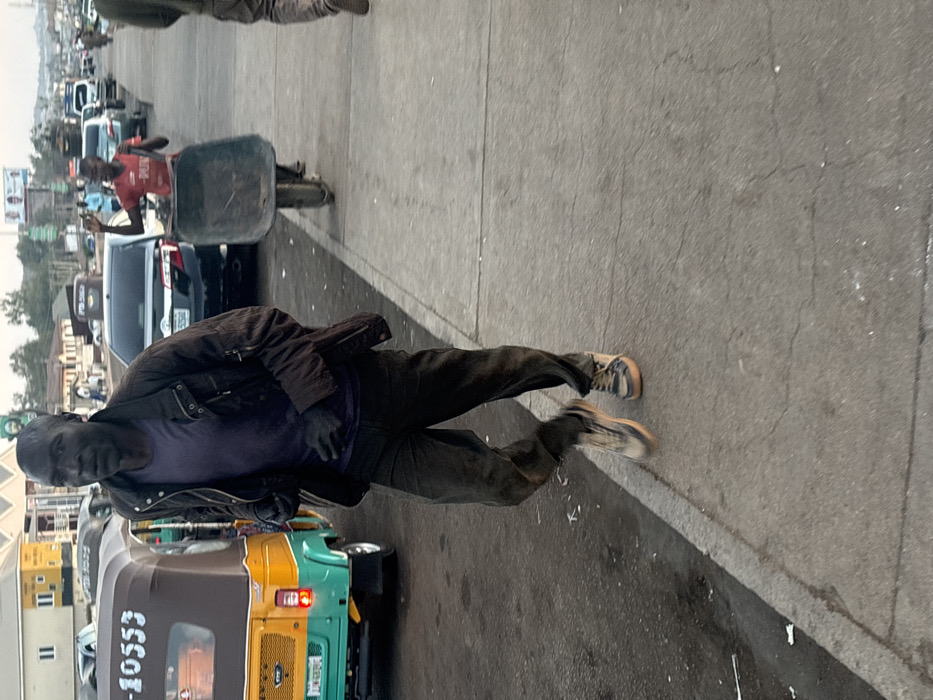 A man in a jacket and pants walks along a street. His shoes are tan with stripes. Next to him, a colorful vehicle displays the number "-10553" on its back. Further down the street, a man pushes a wheelbarrow. Several cars are visible, with buildings lining the background under a bright sky. The scene appears to be a busy street in a populated area.