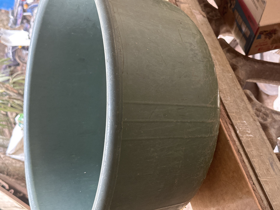 A large, used, dark green plastic basin occupies the majority of the foreground and midground, exhibiting surface scuffs and vertical ribbing on its exterior