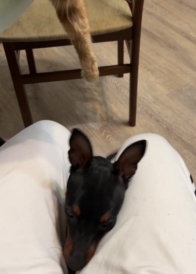 small black and tan dog, possibly a miniature pinscher, sitting between the legs of a person wearing white pants. The dog looks up towards a large orange cat sitting on a chair. The cat leans down and the dog appears to sniff or gently touch the cat's face with its nose. The background includes a wooden floor and furniture. The video is shot from a first-person perspective.