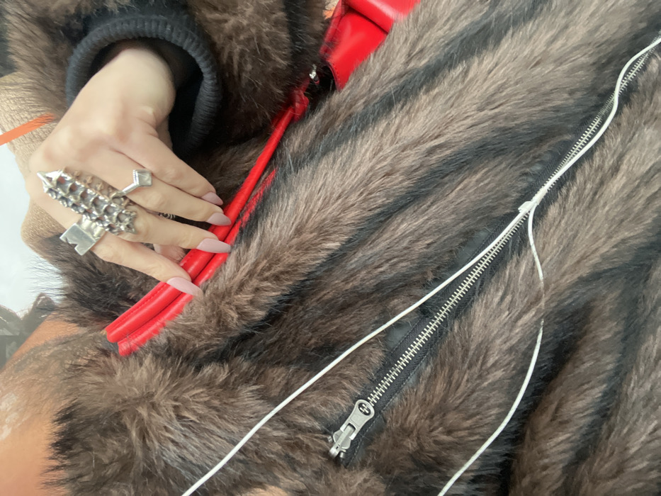The image displays a close-up, high-angle perspective of a human hand resting on a brown and black striped fur or faux fur garment, possibly a jacket or coat. The hand, with light pink manicured fingernails, holds several thin, red, cylindrical objects towards the upper right. Two rings are visible on the hand: a prominent, multi-spiked, silver-toned ring on the middle finger, and a smaller silver-toned ring with a rectangular clear stone on the ring finger. The garment features a silver-toned zipper with a circular pull tab running vertically, partially open to reveal black material underneath. White wires, consistent with personal audio devices, are draped across the fur and zipper. The background is out of focus, showing blurred warm tones. The specific location within the city of London, United Kingdom, cannot be determined from the visual content of the image.