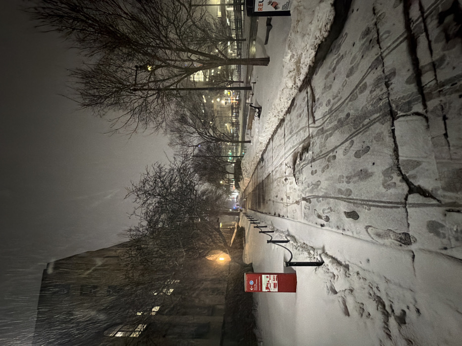 A snowy city sidewalk stretches into the distance. Bare trees line the path, illuminated by streetlights. Footprints and tire tracks mark the snow-covered pavement. A red emergency call box stands on the left. A building is visible in the background. The sky is overcast, and snow is falling. The photo is rotated ninety degrees clockwise.