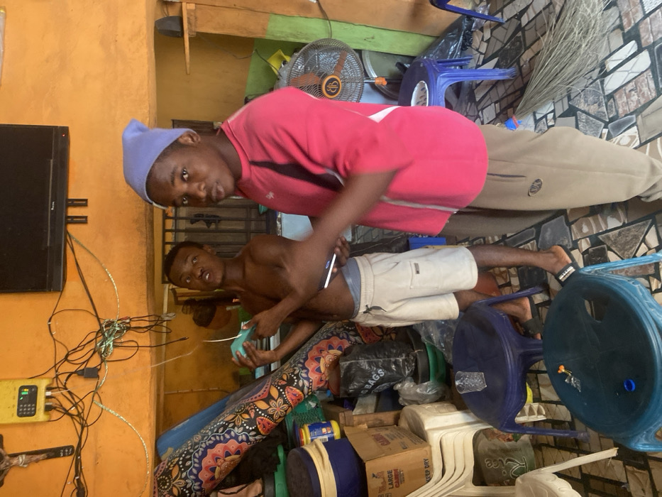 Two young men are inside a room with cluttered belongings. One man wears a pink top and a blue cap, looking at the camera while standing. The other man is shirtless, wearing white shorts, and is holding a blue container. A television hangs on a yellow wall with many cables. The room has a fan, blue chairs, and various stored items.