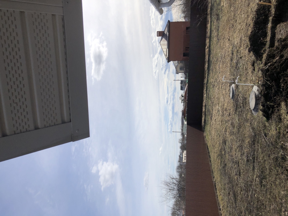 The image displays an outdoor scene in Starokorsunskaya, Russia, captured from a low, upward angle beneath a light-colored, perforated soffit with a metal trim. The sky overhead is light blue with scattered white cumulus clouds. The foreground features a plot of ground covered with dry, sparse, yellowish-brown grass and patches of bare earth, including a pile of disturbed soil in the lower right. Two round, dark grey manhole covers are visible on the ground, with two vertical white PVC pipes of varying heights extending upwards from near them. A dark brown corrugated metal fence forms a property boundary across the midground, with sections illuminated by sunlight and others in shadow. Beyond the fence, a residential landscape extends, including a prominent two-story brick-red house with a dark roof and chimney on the right side. Additional structures, including one with a distinctive round, open-sided roof, along with bare deciduous trees and utility poles, are visible further in the distance. No individuals or animals are present in the scene.