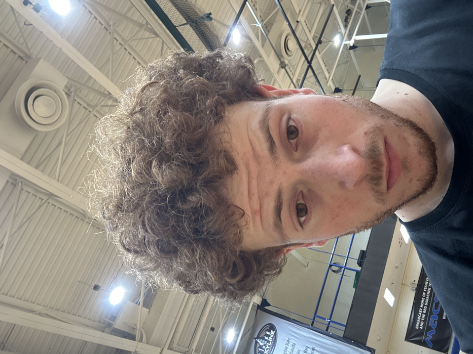 A man with curly brown hair, brown eyes, and a light mustache and beard is looking into the camera. He is wearing a black t-shirt. The background is a gymnasium, with overhead vents and lights visible. Banners with text, including "SKYLINE" and "BROADCAST HOME OF YESHIVA", are hanging in the background. The image is taken at an unusual angle, pointing upwards toward the man.