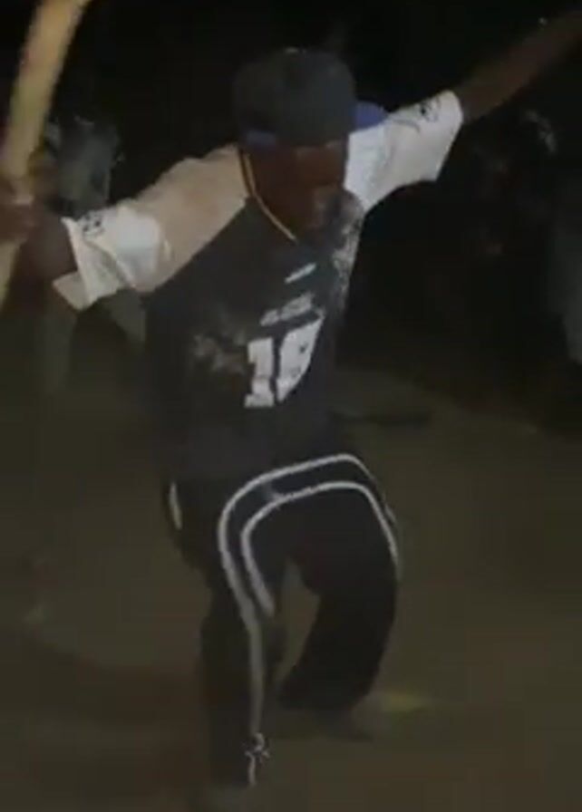 A man in a black and white jersey, blue cap, and dark pants with white stripes dances in a dark outdoor area. He holds a long, wooden stick in his hands, twirling and moving it as he dances. Other people stand around him, some watching. The lighting is poor, making it difficult to see details, but the scene appears to be lively with music and dancing.