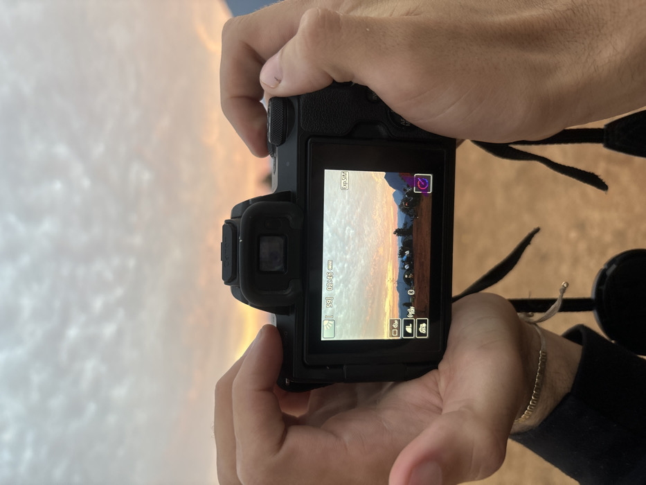 A close-up, first-person perspective image depicts two hands holding a black digital camera, possibly a Canon mirrorless or DSLR, at eye level