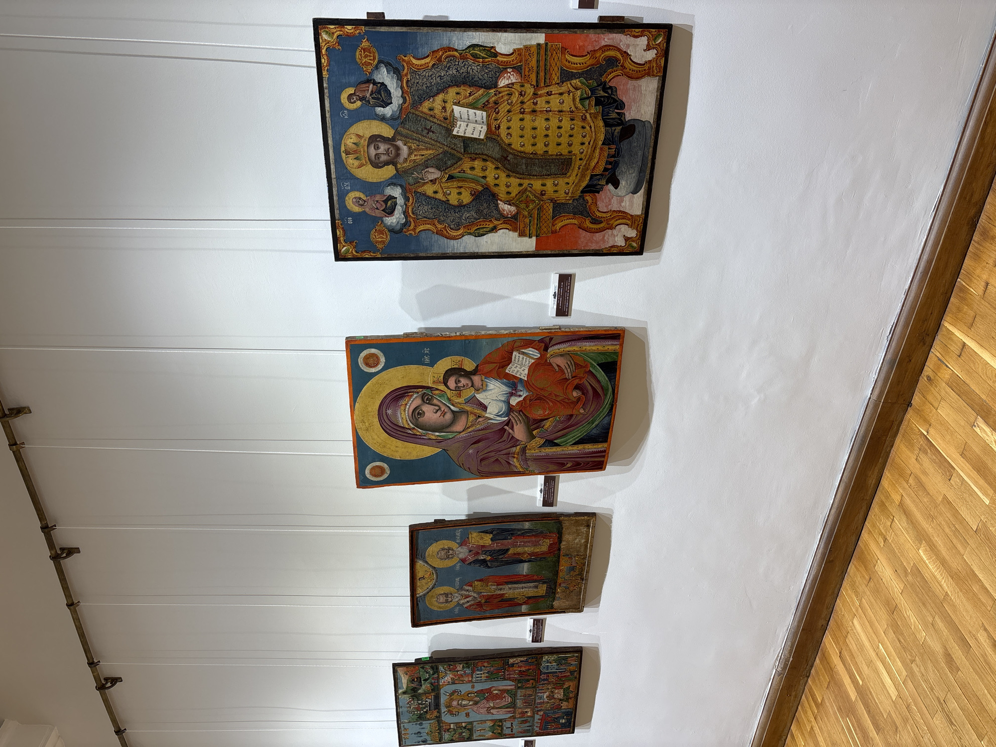 vertical arrangement of four religious icons displayed on a white wall. The wall is located inside a building, presumably a gallery or museum, as indicated by the polished wooden floor and the presence of a hanging system for artwork. The icons depict various religious figures, including Christ, Mary, and possibly saints, rendered in a traditional Byzantine or Eastern Orthodox style. The overall composition and the artifacts suggest a location in Veliko Tarnovo, Bulgaria, a city known for its rich history and Eastern Orthodox heritage, although this is assumed.
