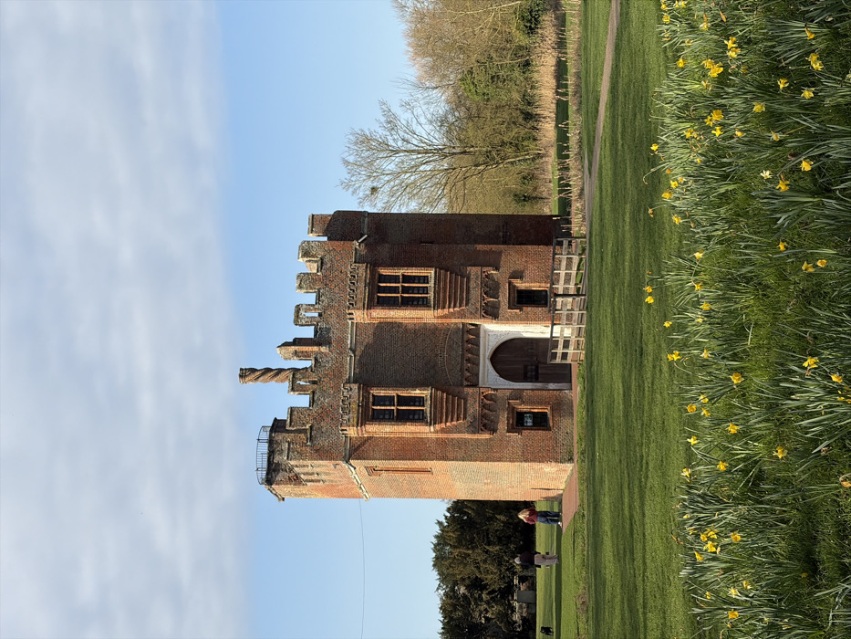 The image depicts Rye House Gatehouse, located in East Hertfordshire, United Kingdom, under a clear blue sky with scattered white clouds. The prominent subject is the red brick gatehouse, rendered in a Tudor architectural style, featuring a castellated parapet with battlements. A distinctive spiral chimney stack rises from the roofline, and a small, circular observation platform or balcony is visible on the top left corner of the structure. The building has multiple tall, rectangular mullioned windows with stone dressings. A large, arched wooden door, framed by white stone trim, is centered on the ground level, fronted by a low wooden fence or barrier. In the immediate foreground, a vibrant green lawn is visible, interspersed with clusters of blooming yellow daffodils. To the left of the gatehouse, two individuals and a small, black dog are present on the grass. One person, dressed in dark clothing, walks away from the camera, accompanied by the dog. The second person, with light-colored hair, wears a red top and dark trousers, facing slightly towards the gatehouse. The background on the left features dense, dark green evergreen trees. To the right, a broader expanse of deciduous trees, mostly bare, suggests early spring foliage. A patch of tall, dry reeds or grasses is situated between the gatehouse and these distant trees, with a faint dirt path visible cutting through the grass on the right. The scene is illuminated by natural daylight, casting subtle shadows.