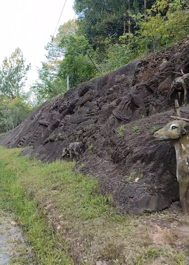roadside scene featuring a rocky embankment adorned with sculpted deer