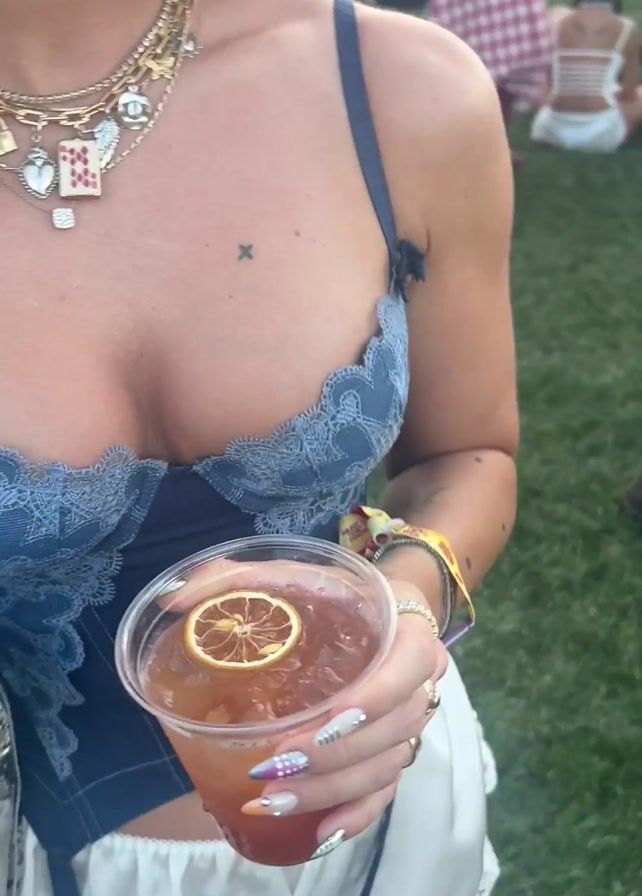 A woman is holding a drink and walking through a crowded outdoor area. The woman has light brown hair and is wearing a blue corset top and white shorts. She has multiple necklaces on, and a silver purse is visible on her left side. The drink she is holding is in a clear plastic cup, with a slice of dried orange on top. Other people can be seen in the background, along with tents. The woman smiles and sticks her tongue out at the camera.
