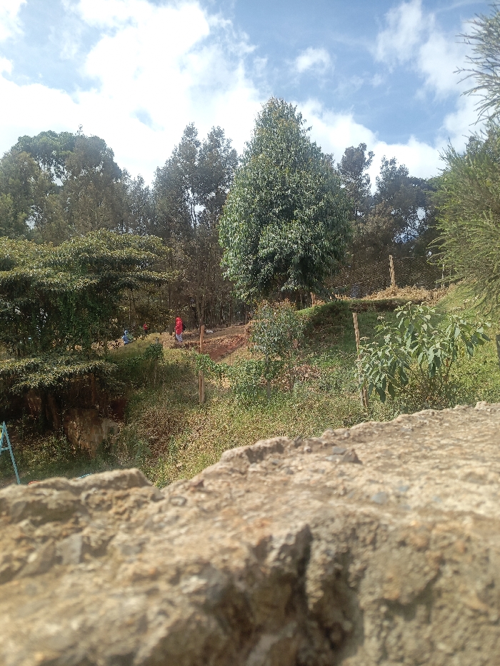 The image depicts an outdoor environment in Ngong ward, Kenya, under a bright, partly cloudy sky. The immediate foreground is dominated by a rough, textured, out-of-focus light-brown rock or concrete surface. Beyond this, the scene descends into a sloped, natural landscape characterized by varied green vegetation, including grass, shrubs, and young trees. A dirt path winds through the left-central portion of the midground. On this path, one individual, dressed in red clothing, is visible standing or walking, facing towards the right. A second individual, wearing blue, is partially visible further left on the path. Several thin, light-colored wooden posts are embedded vertically in the midground's terrain. The background features a dense, mature tree line, primarily composed of dark-foliage trees, with one prominent, vibrant green, conical-shaped tree standing taller near the center. The sky above is blue with scattered white cumulus clouds.