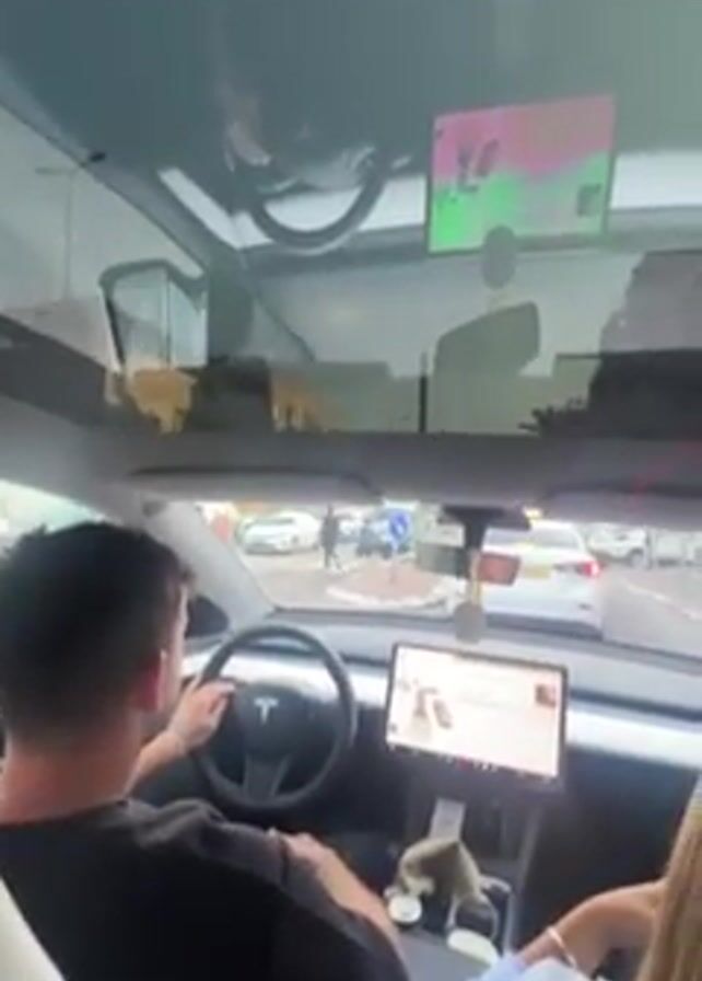 interior of a white Tesla car from the perspective of someone in the back seat, looking forward. A man is driving, wearing a black t-shirt, his hands on the steering wheel. He briefly turns his head to the right. A woman is in the front passenger seat, holding a smartphone. She wears a black and white striped shirt and jeans. A white sweater is on her lap. The car is stopped at a traffic circle. Other cars are visible on the street outside. The Tesla's touchscreen display is on, and a smaller screen is mounted on the ceiling. Loud Arabic music is playing. The interior of the car is bright.