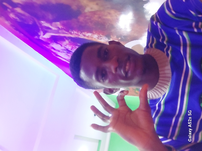A dark-skinned adult male is depicted in a medium close-up, centered, looking directly at the camera with a slight smile. He wears a blue long-sleeved shirt with white and thin black horizontal stripes and a cream-colored ribbed crew neck collar. His right hand is raised near his left shoulder, forming a gesture with the thumb and forefinger partially joined, and the remaining three fingers extended and splayed. The indoor background on the left features a light green wall and a white ceiling illuminated with a purple/pink hue. To the right, the background consists of a wall covered by a decorative mural or wallpaper displaying abstract patterns in purple, brown, and reddish tones. The image is watermarked "Galaxy A52s 5G" in the lower-left corner. The specific location within Onitsha, Nigeria, is not discernible from the visual information provided.