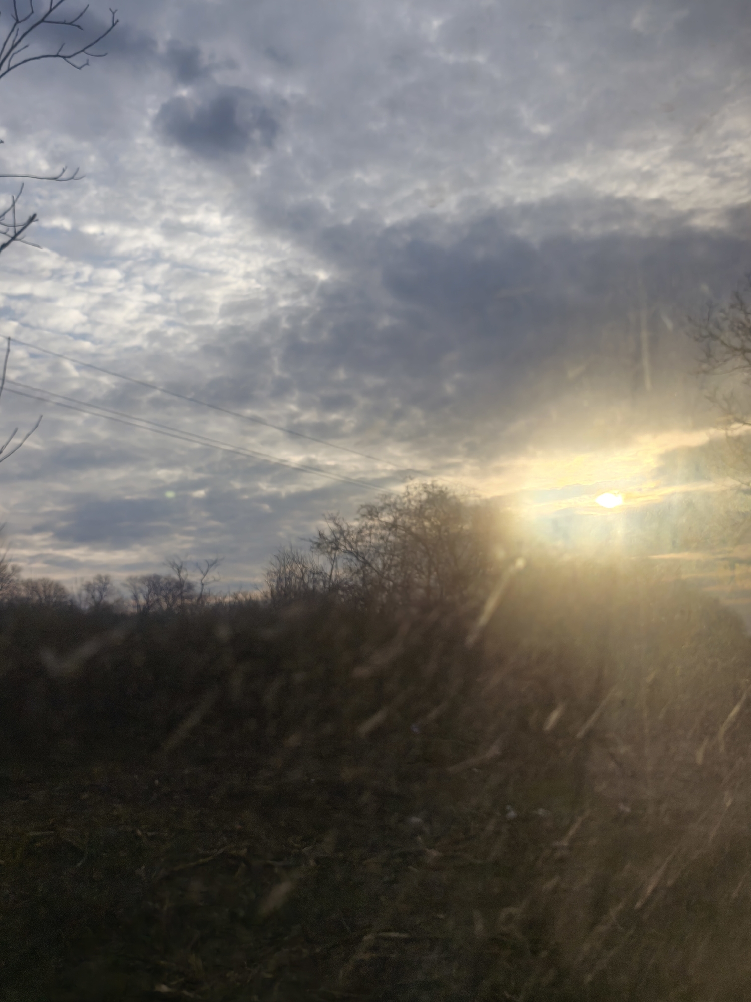 An outdoor landscape photograph depicts a low-angle sun obscured by clouds over a rural or semi-rural environment in Grivitsa, Bulgaria. The upper two-thirds of the image display a sky filled with a mixed pattern of grey and white clouds. The sun, a bright yellowish-white orb, is prominently positioned in the upper right, emitting significant glare and lens flare that streaks across the right side of the frame. Multiple bare tree branches are visible in the upper left, while a dense line of leafless deciduous trees forms a dark, silhouetted horizon across the middle of the frame, separating the sky from the lower third of the image. Across the upper left and central sky, several parallel overhead lines, consistent with power or communication cables, are discernible. The lower third of the image shows dark, uncultivated ground, possibly fallow earth, with minimal vegetation and debris. No individuals, animals, or specific structures other than the power lines are identifiable. Fine streaks, potentially from rain or debris on a viewing surface, are present throughout the image, particularly evident in the lower right.
