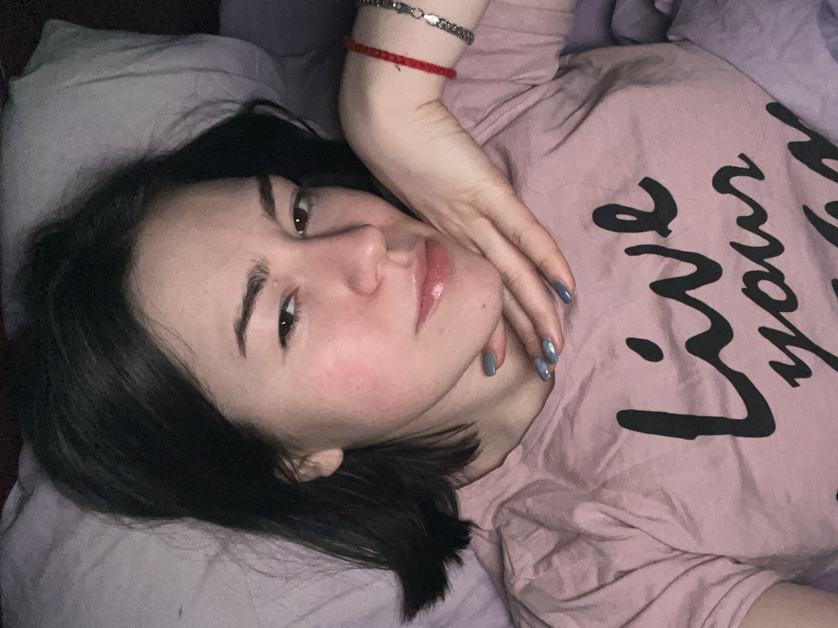 A young woman with dark hair lies on a light purple pillow, looking at the camera. She wears a light pink t-shirt with the words "Live your" written in bold, black script. Her right hand is near her face. She has bracelets on her left wrist. Her nails are painted a cool tone. The lighting is soft, giving the image a gentle, relaxed mood.