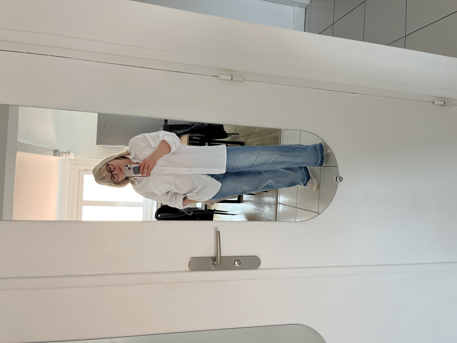 The image displays a full-body mirror selfie taken by an adult female in an indoor residential setting. The subject, possessing blonde hair and wearing black-framed eyeglasses, is dressed in a white, loose-fitting, long-sleeved collared shirt with the sleeves rolled to her forearms. She also wears light blue, wide-leg denim jeans with frayed hems and white sneakers. Her right hand holds a light-colored smartphone, positioned for the photo, while her left hand is partially inserted into the left front pocket of her jeans. The mirror, an elongated oval with rounded ends, is mounted on a white door. A silver-toned door handle and lock assembly are visible on the left side of the door, with hinges on the right. The reflected background reveals an interior space featuring light-colored walls and a tiled floor composed of light-grey square tiles with darker grout lines. A dining table with dark-colored chairs is visible, along with a stainless steel refrigerator in the upper right area of the reflection. A window with white frames allows natural light into the space. A ceiling light fixture is also discernible, contributing to the room's illumination. The specific location within the city of Cannes, France, cannot be determined from the visual information provided in the image.