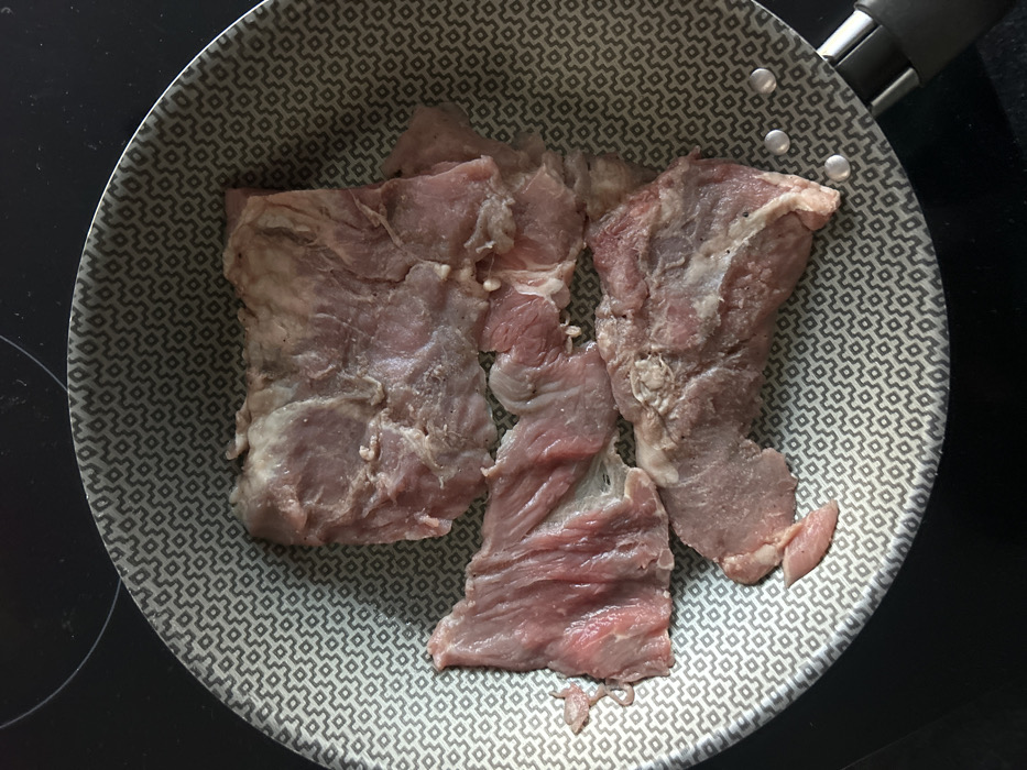 - "An overhead shot depicts raw meat in a frying pan on a stovetop, situated in a kitchen environment in San Bernardino Tlaxcalancingo, Mexico" by FM-1wgVx1, licensed under CC BY 4.0