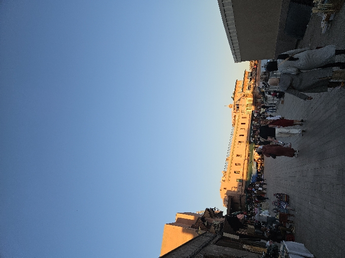 A street scene basks in golden sunlight, lined with a long, fortress-like building featuring numerous windows. People stroll along the cobblestone street, while market stalls selling various goods line the sides. The sky is clear and blue. The scene captures the bustling atmosphere of a marketplace in a historically rich urban area.