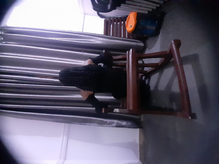 Within an indoor setting in Narayi, Nigeria, a single individual is depicted from behind, seated in a dark reddish-brown wooden rocking chair. The person possesses long, dark braided hair and wears a dark, off-the-shoulder garment with long sleeves. The individual faces away from the camera, towards a wall covered by light grey, floor-length pleated curtains. To the immediate left of the curtains is a light-colored wall. The floor is dark-colored. In the background on the right, partially visible, are additional wooden furniture items, including a slatted piece, and a blue and orange cylindrical object, consistent with a canister vacuum cleaner, positioned near other indistinct vertical objects. Natural light appears to enter from behind the curtains, illuminating the scene.