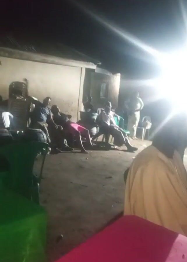 At night, several individuals are gathered outside a building with a flat roof. Most of the people are seated on chairs, while a few are standing. There are green and pink table covers in the foreground. A bright light shines intermittently, obscuring some details. The overall setting appears casual.