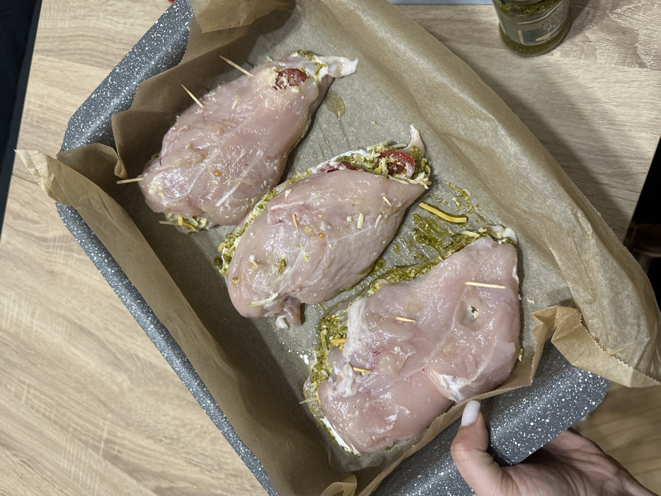 This image depicts a close-up, high-angle view of a grey, speckled baking tray lined with crumpled brown parchment paper, resting on a light wood-grain countertop. Three raw chicken breasts, visibly stuffed, are arranged within the tray. Each chicken breast is secured with several wooden toothpicks, holding in a green, pesto-like sauce, small white pieces resembling cheese, and red components, possibly cherry tomatoes or red peppers. Liquid, likely oil or rendered fat, is visible around the stuffed chicken. A human hand, with light-colored fingernail polish, is observed holding the lower-left edge of the baking tray. In the bottom right corner, a small glass jar containing a green substance, consistent with pesto, is partially visible. The scene is consistent with food preparation in a kitchen environment. No visual information within the image can confirm a specific location in the city of Haskovo, Bulgaria, or any other geographical area.