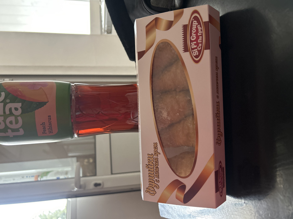 A light pink rectangular box of pastries, labeled in Bulgarian as 'Фундуики с млечен крем' (Fundoiki with milk cream) and displaying the 'Si Pi Group' logo, rests on a dark, reflective surface in Byala, Bulgaria. A clear window on the box reveals several sugar-dusted, rolled pastries. Directly behind the box, a bottle of Pure Leaf Peach Hibiscus Iced Tea, containing a reddish-orange liquid, stands upright. The background features a white door frame with a handle on the left, through which green foliage is visible, and a bright window on the right. A dark fabric item is partially visible on the right edge of the frame. No individuals are present, and no actions are observed.