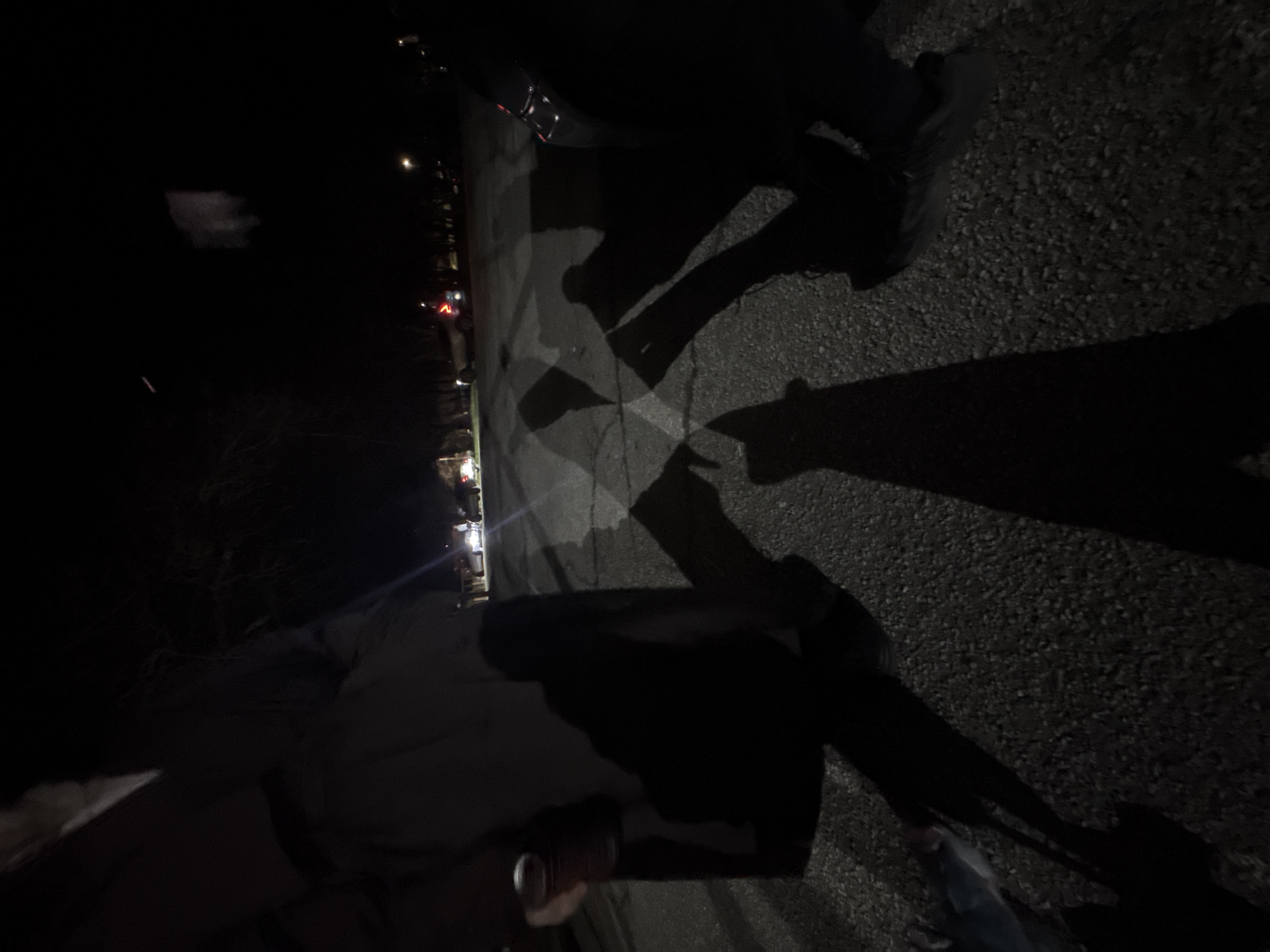 The image depicts a nighttime scene in an urban environment within Haskovo, Bulgaria, consistent with a street or parking lot. The foreground consists of a dark, textured asphalt or gravel surface, upon which at least three distinct human shadows are cast, indicating the presence of multiple individuals. On the far left, the partial upper torso and left arm of one person are visible, holding a red beverage can. On the far right, the lower leg and foot, clad in a dark athletic shoe, of another individual are present. The background is largely dark, with silhouettes of trees and multiple vehicles visible. A light-colored SUV is prominent in the mid-ground, displaying illuminated taillights. Distant artificial light sources, including streetlights, create the strong directional shadows in the foreground and provide ambient illumination to parts of the background.