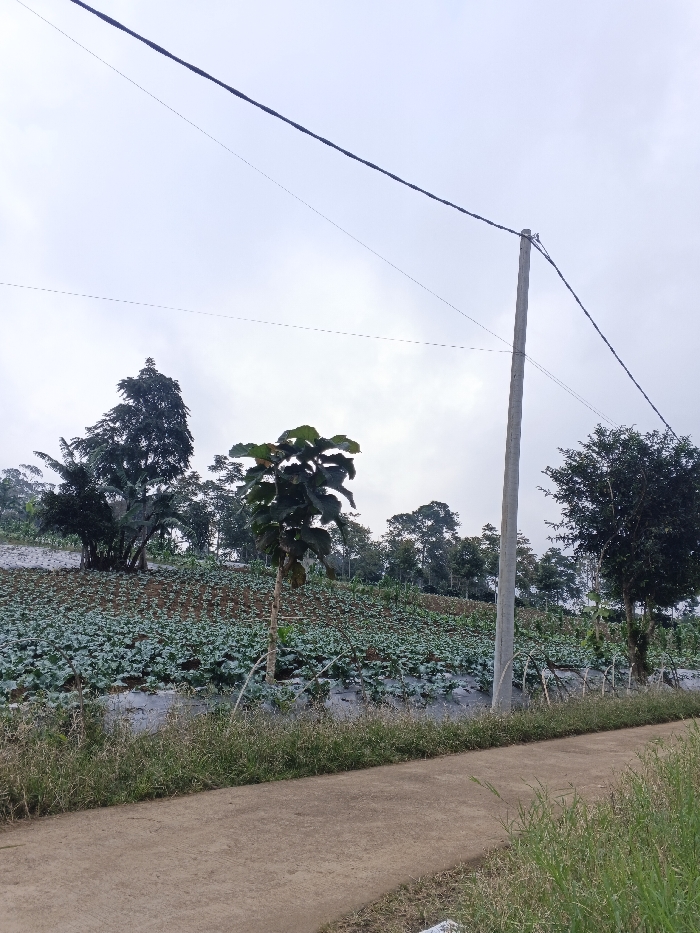The image displays an agricultural landscape located in Clacuc, Timor-Leste, viewed under an overcast, light grey sky. In the immediate foreground, a light brown, unpaved pathway or road, approximately 1.5 meters wide, extends horizontally across the frame. Its edges are defined by unkempt green and brown grasses. Beyond the pathway, a cultivated field slopes upwards and to the left, covered predominantly by rows of small, round, green leafy plants, consistent with young Brassica crops, planted through a dark grey or black plastic mulch system. Several trees are present throughout the scene. A solitary, medium-height tree with large, dark green leaves stands centrally in the field. To the far left, a dense cluster of taller trees, some with broad leaves suggesting banana plants, forms a backdrop to the planted field. Towards the right side of the field, a tall, slender grey concrete utility pole rises vertically, supporting multiple black electrical cables and thinner wires that stretch across the upper portion of the sky. Another dark, full tree is positioned to the right of the utility pole. The background features a dense treeline on a distant incline, forming a natural horizon. No human or animal subjects are visible.
