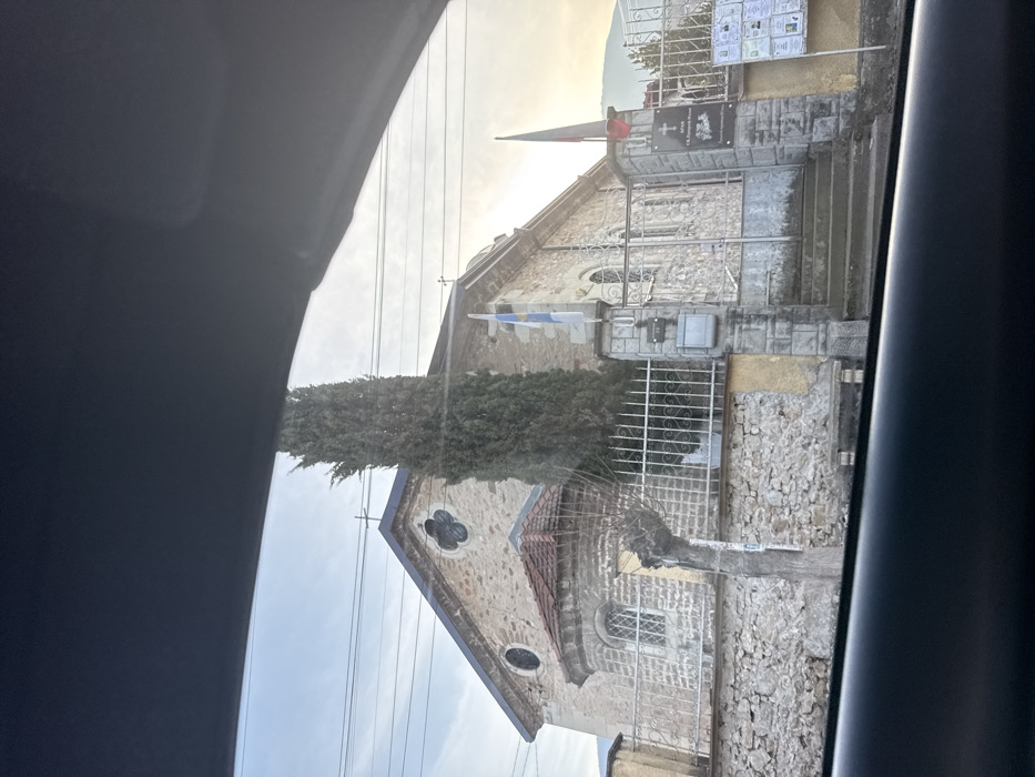 The image displays a stone-built church, identified by a plaque as likely "Temple St. George" (ХРАМ СВ. ГЕОРГИ), situated in Cherven, Bulgaria. The church features a light-colored stone facade with a dark-tiled roof. Architectural details include a prominent quatrefoil window on the main gable and two round windows, one on the main facade and another on a semi-circular apse covered by a red-tiled roof. Crosses are visible at the peaks of the rooflines. The church grounds are enclosed by a low stone wall topped with a black ornamental metal fence. A double-leaf metal gate with steps leads to the entrance, flanked by two stone pillars. Two flags are mounted on poles near the gate: one blue, yellow, and white, and another red, white, and green tricolor. A black plaque with a white cross and Cyrillic text is affixed to the right gate pillar, and a public notice board with multiple papers is visible further right. A tall, slender cypress tree stands behind the fence to the right of the church's main section. A bare, pruned tree trunk is visible to the left of the gate. Overhead, multiple power lines traverse a pale blue sky. Distant mountains are discernible on the horizon to the right. The lower portion of the image is obscured by a dark, unidentified foreground element, consistent with a view from inside a vehicle. No individuals are present in the scene. The lighting suggests a day with soft, natural illumination.