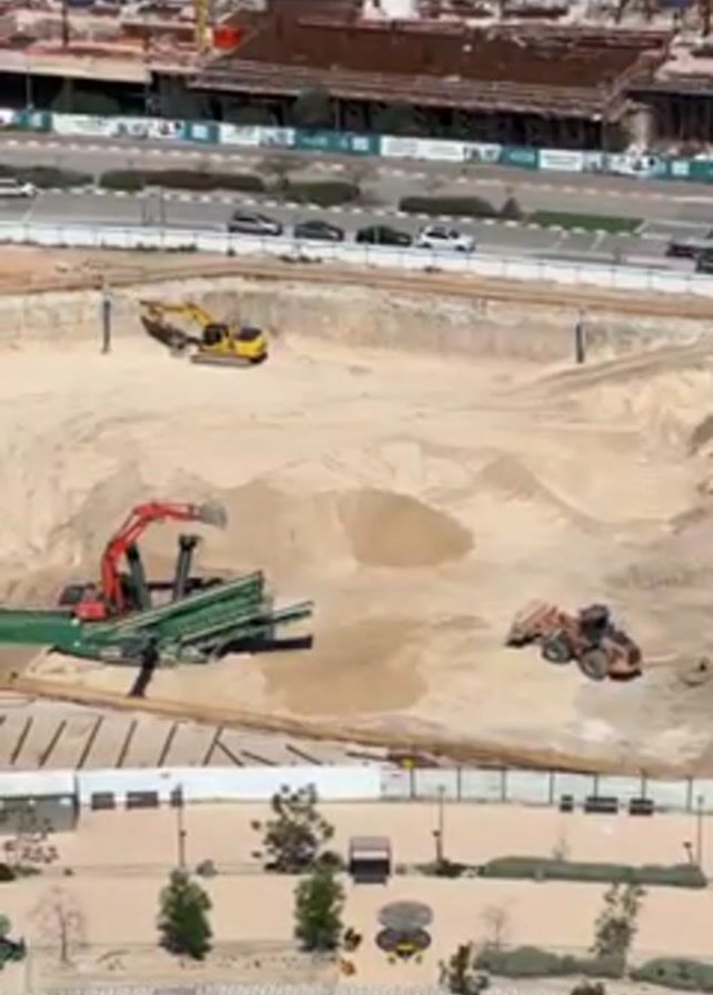 high-angle shot of a construction site. A large, sandy pit dominates the foreground, where an orange excavator, a yellow excavator, and an earth compactor are positioned. The orange excavator appears to be feeding material into a green and black screening machine. A roadway with moving cars is visible behind the construction pit, and beyond that, a partly constructed building is seen. In the very bottom of the frame, there is a landscaped area with small trees, walkways, and round, black objects on the ground.