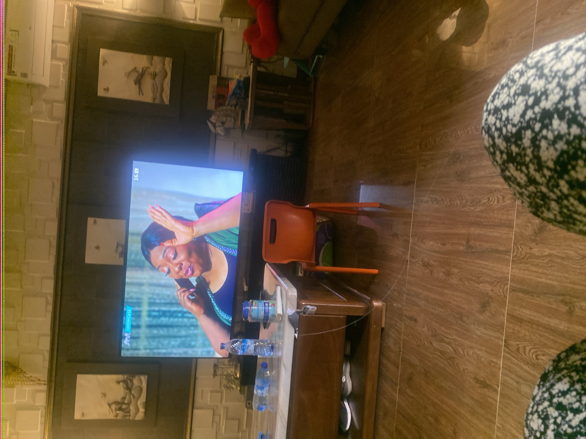 This image depicts an indoor residential living space in Barden Yana, Nigeria, viewed from a low perspective. In the immediate foreground, the knees and lower thighs of a person are visible, clad in black fabric with white speckles. The floor consists of glossy, light brown wood-laminate tiles with prominent grain patterns. A large, wall-mounted flat-screen television is centrally positioned, displaying an adult female with light-toned skin, dark hair, wearing a blue top with a green or teal overlay. She is actively holding a dark-colored mobile phone to her right ear with her right hand and making a gesture with her left hand, palm up and fingers splayed. Her fingernails are painted red. The television screen shows "M-Net Showcase" in the upper left corner and "16:19" in the upper right. Below the television is a dark wooden coffee table with a light-colored, possibly marble, top. On the table, an upright clear plastic water bottle and another horizontal clear plastic water bottle are present. A blue and clear plastic jar sits next to a small book or paper. An orange plastic chair with a simple design is positioned in front of the coffee table. Beneath the coffee table, two pairs of athletic shoes are visible. To the left of the television, on the wall, a framed artwork depicting a stylized landscape or scene is mounted. Another similar framed artwork is to the right of the television. The wall behind the TV setup features textured, light-colored wallpaper with a square pattern. An air conditioning unit is mounted on the upper right wall. To the far right, a section of a brown sofa is visible, with a red, fluffy object, likely a cushion or toy, resting on it. A small wooden side table with vertical slats stands to the right of the television stand, and a small, light blue stool is partially visible behind it. A black speaker or electronic device is situated on the floor to the left of the TV stand.