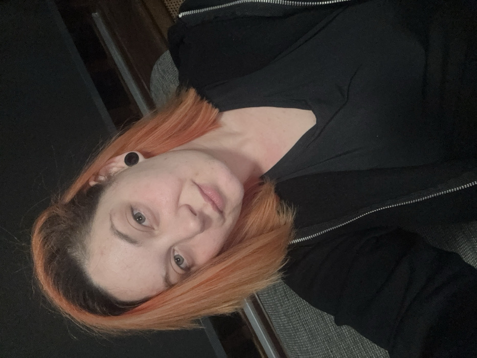 A female individual is depicted in a close-up, self-taken photograph. Her hair is dyed an orange-red color, exhibiting visible darker roots, and extends to approximately shoulder length. Her facial expression is neutral, with a slight upward curve to her lips. The left earlobe displays a black circular ear gauge. She is attired in a black V-neck top worn beneath an unzipped black hooded sweatshirt with a prominent silver zipper. The background is indistinct and dark, with a textured, possibly fabric, surface visible to the lower left, indicative of an indoor environment. This scene is situated in the city of Sliedrecht, Netherlands.