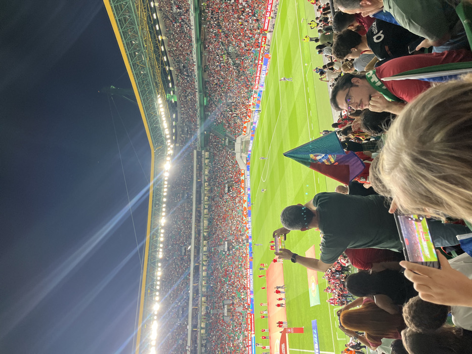 A crowded soccer stadium at night, filled with spectators. People are taking pictures and videos with their phones. The field is illuminated and populated with players, some lined up for a ceremony. The stadium roof is visible, with bright lights shining down. A Portuguese flag is visible among the crowd. Everyone is dressed in red, green, and white to show support for their team.