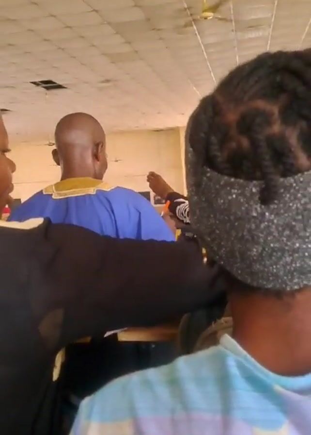 interior of a large, presumably university, lecture hall. There are many students seated in rows, facing the front. The room is lit by natural light streaming in through several windows along the back wall. The speaker is out of view but their voice can be heard. The camera pans to show the full extent of the room. The ceilings are white and paneled. There are ceiling fans. A man in a blue tunic with gold trim is in the foreground. The overall setting looks institutional, perhaps a public university.