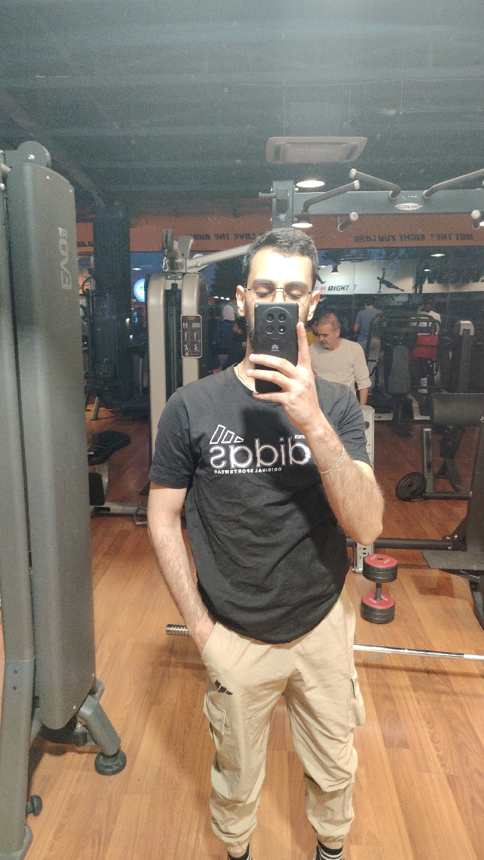A man takes a mirror selfie at a gym. He wears glasses, a black t-shirt with “adidas” printed backward, and khaki cargo pants with black socks. A weight machine sits to his left. The gym's background includes exercise equipment, other patrons, and motivational slogans on the walls. The floor is a shiny wood. The lighting appears fluorescent.