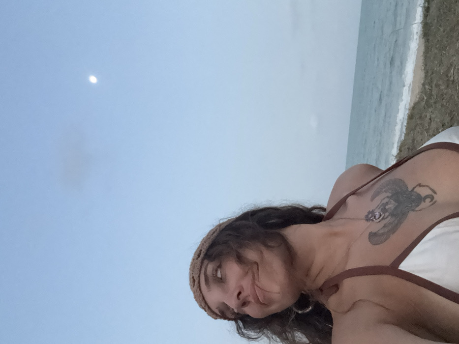 The image depicts an adult female on a beach in Ban Pang Pring, Thailand, during twilight or dawn. She is positioned in the left-central foreground, looking upwards and to the right with a slight smile. She has dark, wavy hair and wears a light-colored bikini top with brown trim, complemented by a light brown crocheted headband and a silver hoop earring on her left ear. A prominent dark-inked tattoo of a winged scarab or insect is visible on her sternum. The background features the ocean with small waves on a narrow shoreline, under a pale blue sky where a distinct crescent moon is visible in the upper right.
