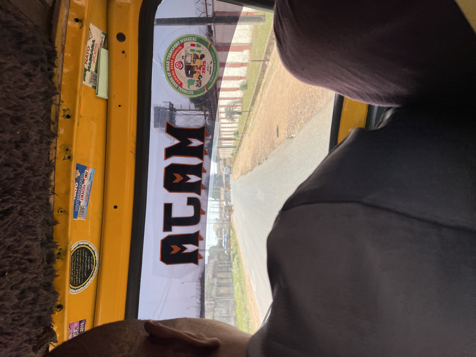 The image captures a forward-facing view from inside a yellow-framed vehicle, likely a tricycle, onto a paved two-lane road in Unknown City, Unknown State. Two individuals are partially visible in the foreground, seated with their backs to the camera. The person on the left wears a dark-colored shirt, with the right side of their head and ear visible. The person on the right wears a dark purplish or brownish shirt. The vehicle's interior features a dark, fuzzy material on the ceiling. Numerous stickers are affixed to the yellow frame above the rear window: a circular sticker with Arabic script, blue and green stickers marked "NATO NABARA 2025" with QR codes, and a prominent circular sticker with a green border reading "NATIONAL UNION OF ROAD TRANSPORT WORKERS KADUNA STATE COUNCIL," featuring an image of a tricycle in Nigerian flag colors and the year "2025." A large, stylized sticker with orange and black lettering spelling "MCAM" is applied to the inside of the rear window, partially obscuring the view. The road ahead is asphalt, extending into the distance under what appears to be an overcast sky. On the right side of the road, there is a dirt shoulder bordered by a low, white concrete wall topped with red capstones. Beyond the wall, green vegetation, including a small palm tree, is visible. In the background, a tall, grey water tower stands, possibly part of a compound partially enclosed by barbed wire fencing. On the left side of the road, a dirt shoulder abuts distant buildings and utility poles with overhead wires. Several other vehicles, including additional tricycles, are visible in the far distance on the road.