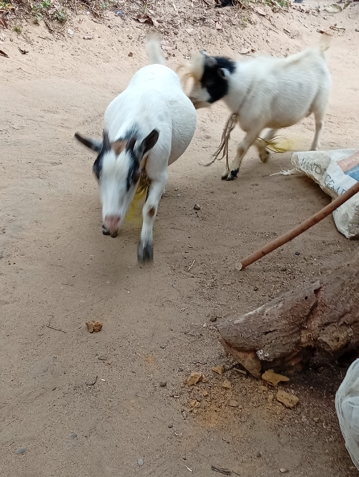 The image displays an outdoor scene in Mbak Ikot Abasi, Nigeria, on unpaved reddish-brown dirt ground. Two domestic goats are present. In the foreground, a white goat with black and brown patches on its head and ears is moving towards the camera, with its head lowered. A yellow stain is visible on its lower chest and front legs, and its legs show motion blur. In the background, to the right, a second white goat with a black face and ears is partially visible, appearing to move away or stand; a light-colored, possibly frayed rope or tether hangs from its neck, and a yellow stain is present on its lower rear abdomen/leg area. The ground surface is characterized by scattered small rocks, pebbles, dried leaves, and organic debris. On the right side of the frame, a dark, weathered log lies horizontally, partially obscured by a diagonal wooden stick or pole. Behind the log, a torn, white bag partially labeled "MAND CEMEN" is visible. The background consists of more dirt ground and minimal, indistinct vegetation.