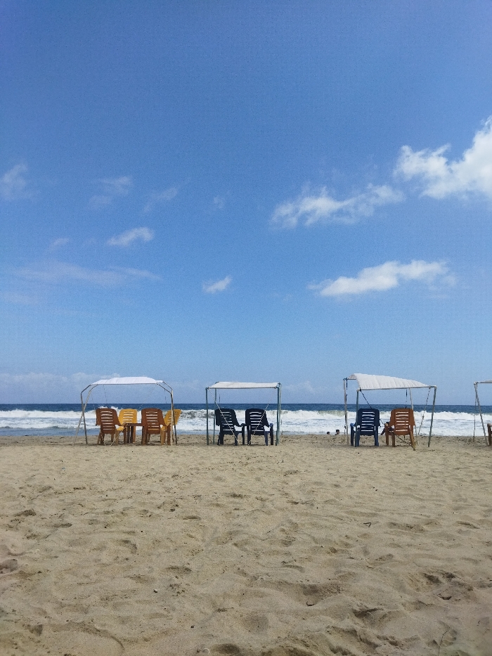 A beach scene on a sunny day. The sky is blue with scattered clouds. Three seating areas, each with a white canopy frame, are set up on the sand. The seating areas have various colored plastic chairs beneath them. Waves can be seen in the background where the sea meets the sand.