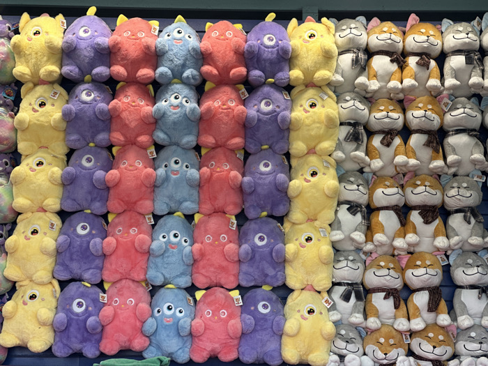 This image depicts a densely packed wall of plush toys, characteristic of an arcade prize display, located on the Santa Monica Pier in Santa Monica, California, United States. The toys are meticulously arranged in horizontal rows and vertical columns against a dark teal background. The left side of the display features multiple columns of monster-themed plush toys, approximately eight rows deep. These include: * Yellow, rounded plush toys with two small yellow protrusions, a single large eye with a black pupil, small pink cheeks, and a smiling mouth. * Purple, rounded plush toys with a single large central eye with a black pupil and a small, closed mouth. * Red, rounded plush toys with two small eyes, a smiling mouth, and two small red ears/antennae. * Light blue, rounded plush toys, some featuring two small eyes and a smiling mouth, and others with three vertically aligned eyes and a smiling mouth. All monster plush toys are soft-textured and appear to be uniform in size. The right side of the display presents multiple columns of dog-themed plush toys, also approximately eight rows deep. These resemble Shiba Inu dogs and are arranged in alternating color patterns: * Tan and white plush dogs, featuring closed, smiling eyes, a black nose, pointed ears, and a dark brown plaid scarf around the neck. * Gray and white plush dogs, featuring closed, smiling eyes, a black nose, pointed ears, and a dark plaid scarf around the neck. All dog plush toys are soft-textured and uniform in size, each wearing an identical plaid scarf. The toys are individually secured to the wall, forming a continuous and vibrant display. No individuals are visible within the frame.
