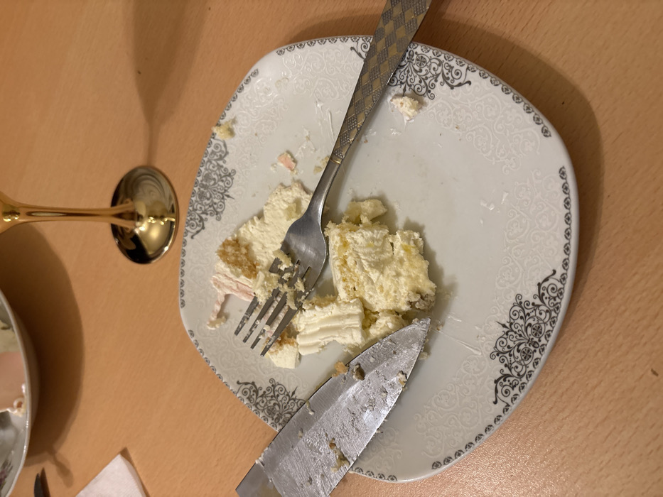 - "An overhead shot shows a partially eaten piece of cake on a patterned plate" by FM-4QNTW2, licensed under CC BY 4.0