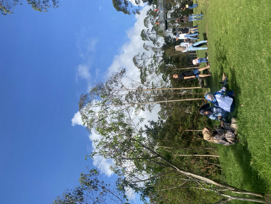 group of people standing and sitting on a grassy slope in Kecamatan Tawangmangu, Indonesia
