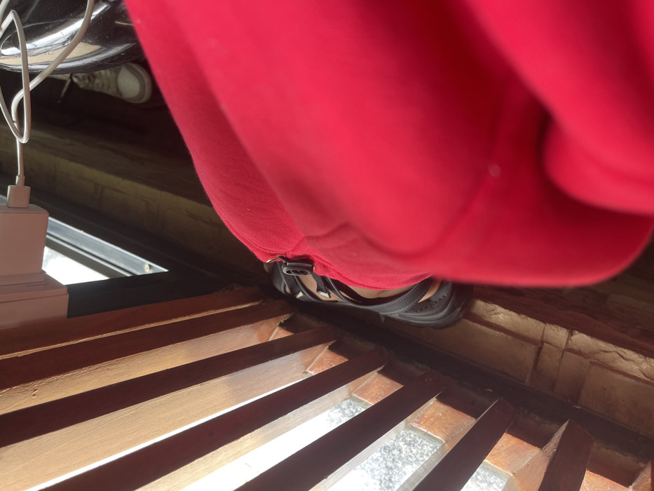 The image depicts a close-up, first-person perspective view of a person's right leg, primarily encased in bright red fabric, likely trousers