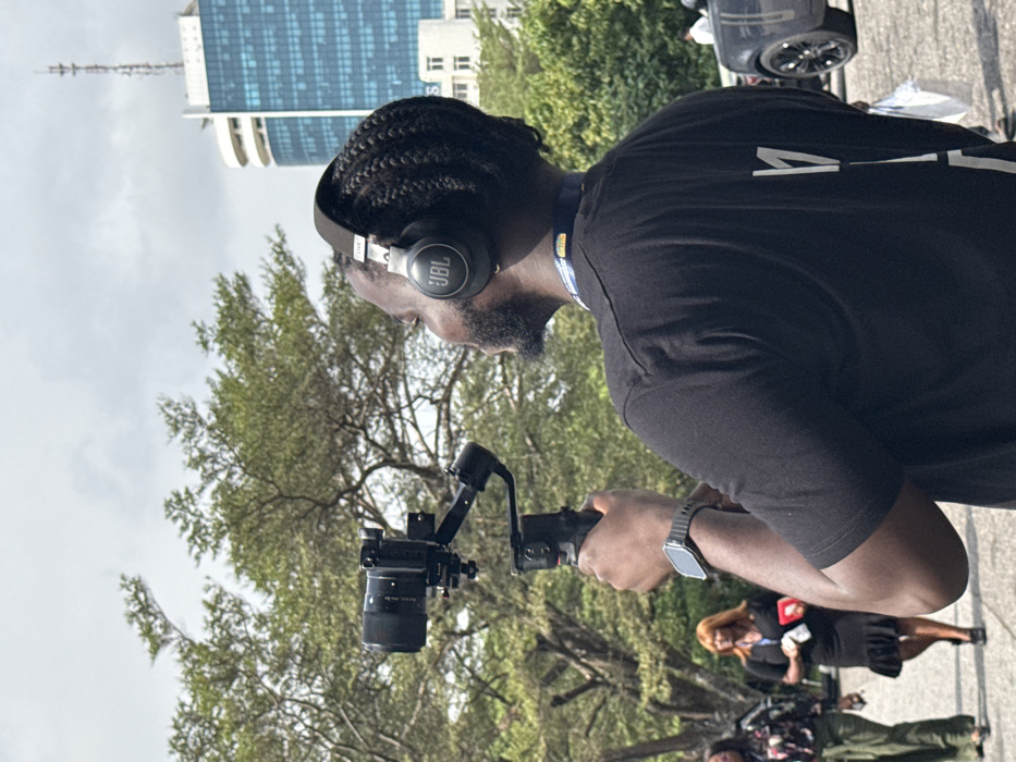 The scene depicts an outdoor urban environment in Itirin, Nigeria, under an overcast sky. In the foreground, facing away from the viewer with a slight turn to the left, is an adult male with dark skin, braided hair, and a beard. He is wearing a black short-sleeved t-shirt, a blue and yellow lanyard around his neck, black JBL over-ear headphones, and a dark smartwatch on his left wrist. He holds a black mirrorless camera mounted on a handheld gimbal stabilizer with both hands, positioned at waist level, and appears to be operating or monitoring the equipment. His gaze is directed upwards and to the left of the frame. In the mid-ground, to the left of the primary subject, two women are walking. One woman wears a black short-sleeved dress with a ruffled hem and holds a red object. The other woman wears a patterned long-sleeved top and olive green trousers. Behind them and extending across the mid-ground are multiple deciduous trees with green foliage. In the far background, to the right, a multi-story modern building with a blue-tinted glass facade and a communication tower on its roof is visible. A portion of a dark-colored SUV is parked in the lower right background. The ground is paved, and the overall lighting suggests daytime with diffused sunlight.