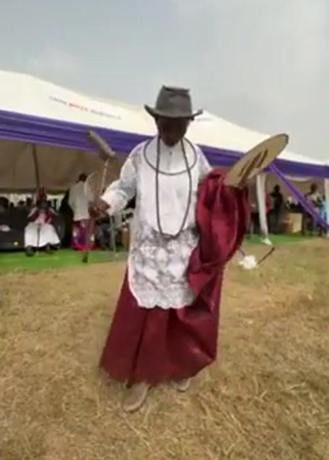A person dressed in a white lace shirt over a red skirt, a brown hat, and brown sandals is dancing in a grassy field. The person is carrying a drum in their left hand and a small stick in their right. The drum is white with a brown design. They are also holding a red cloth over their left shoulder. In the background, there are white tents with purple accents and people sitting under them. The sky is overcast.