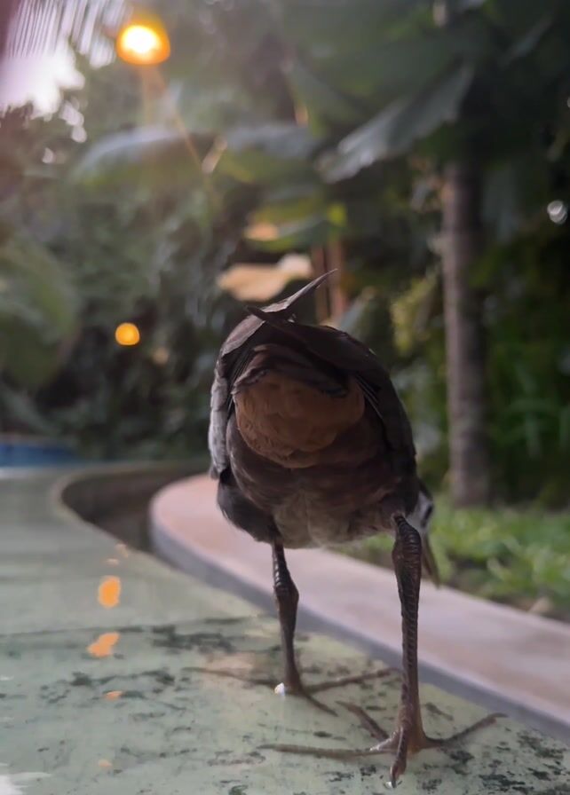 A bird with a brown chest and dark gray wings and back stands with its back to the camera on a flat, light-colored surface. The bird has long, thin legs and small feet with visible claws. The background is a blurred outdoor scene featuring lush green foliage, including palm trees, and the edge of a pool or water feature with lights reflected on the surface. The lighting suggests it's either dusk or dawn.