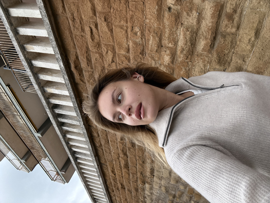 A medium-shot portrait captures a young adult female in an outdoor urban setting, identified as Anzio, Italy. The subject has light brown hair, fair skin, and is looking upwards and to her right with her lips slightly parted. She is wearing a light beige, ribbed, quarter-zip sweater with a dark zipper, layered over a white t-shirt. A silver-colored ear cuff adorns her right ear. The immediate background consists of a textured wall composed of irregular, light brown stone blocks. Above this wall, a weathered concrete balustrade with vertical posts is visible. Beyond the balustrade, a multi-story building with multiple balconies and metal railings is partially visible against a light, overcast sky.